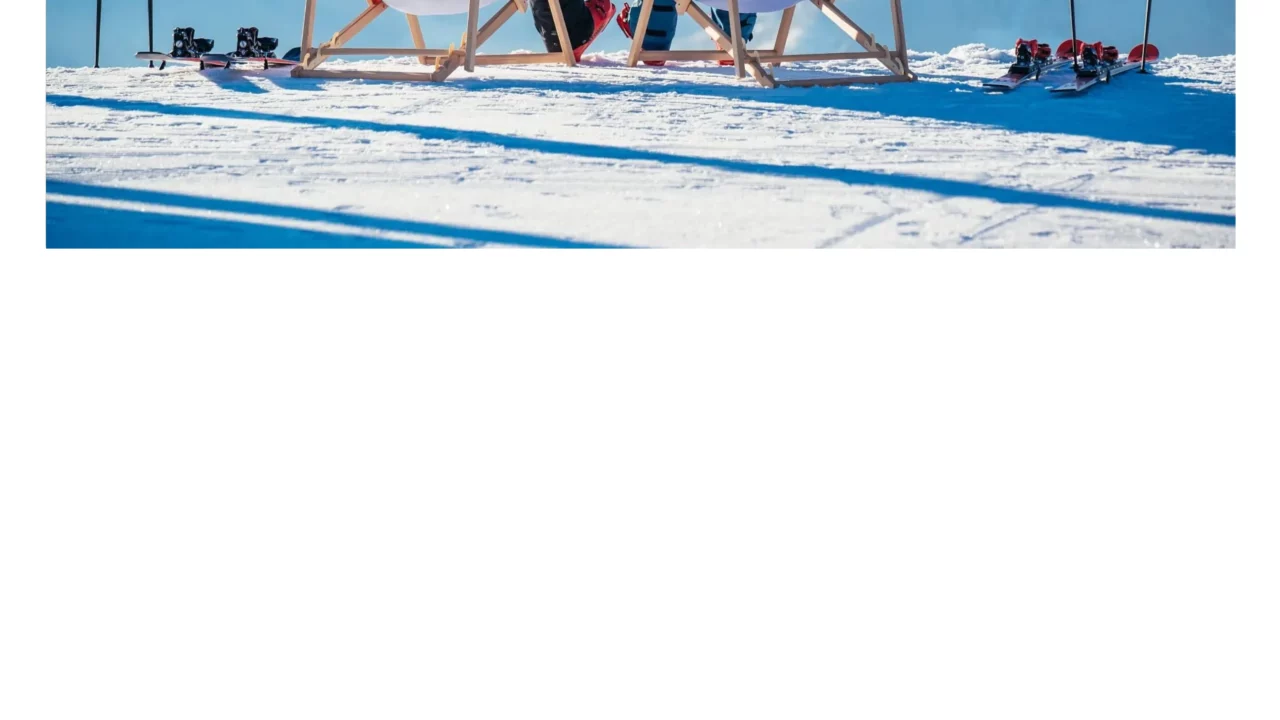 Zwei Personen entspannen in Liegestühlen im Schnee.